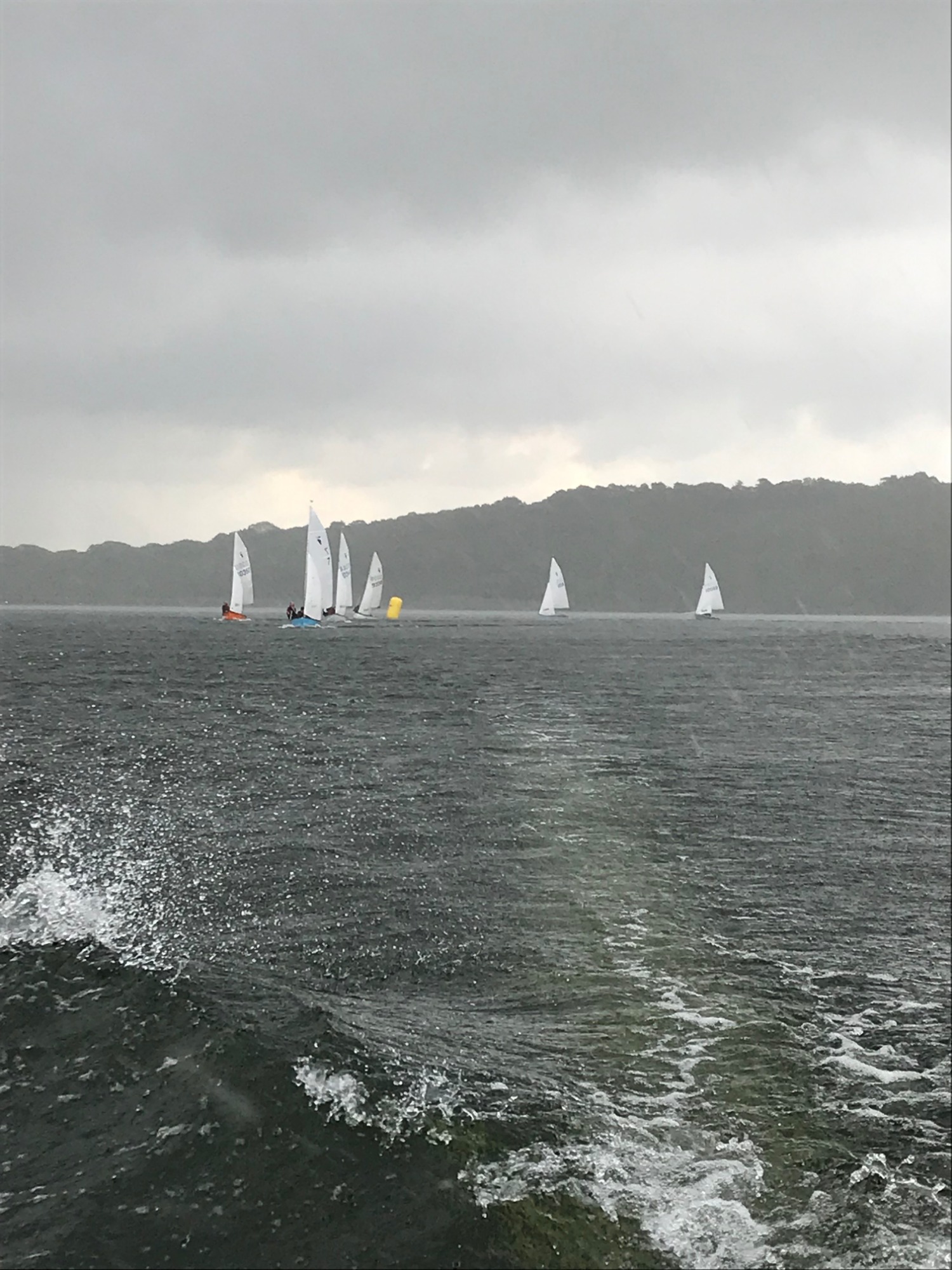 Clouds bubbled up from the north just before the first start and very soon heavy rain poured down, drenching everyone. Squally winds changed the blue rippled water to a gloomy grey scene appearing like an angry sea. The sharp increase in wind meant visibility was virtually zero for the first windward leg. The fleet sailed on. By the second lap the storm had passed and the sun returned. Dave Butler and Emily Clixby quickly established a lead and went on to win the race, followed by Mike and Anne de St Paer, then Jon and Verna Hunt.